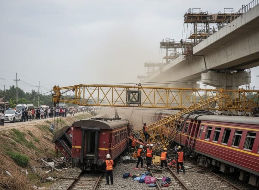थाईलैंड के पूर्वोत्तर हिस्से में बुधवार को एक हृदयविदारक रेल दुर्घटना घटी। नाखोन रत्चासिमा प्रांत में एक निर्माणाधीन ओवरपास पर काम कर रही विशालकाय क्रेन अचानक अनियंत्रित होकर नीचे से गुजर रही पैसेंजर ट्रेन पर जा गिरी। लगभग 65 फीट की ऊंचाई से गिरे मलबे और भारी लोहे की क्रेन ने ट्रेन के ऊपरी हिस्से को बुरी तरह क्षतिग्रस्त कर दिया, जिससे ट्रेन के कई डिब्बे पटरी से उतर गए।