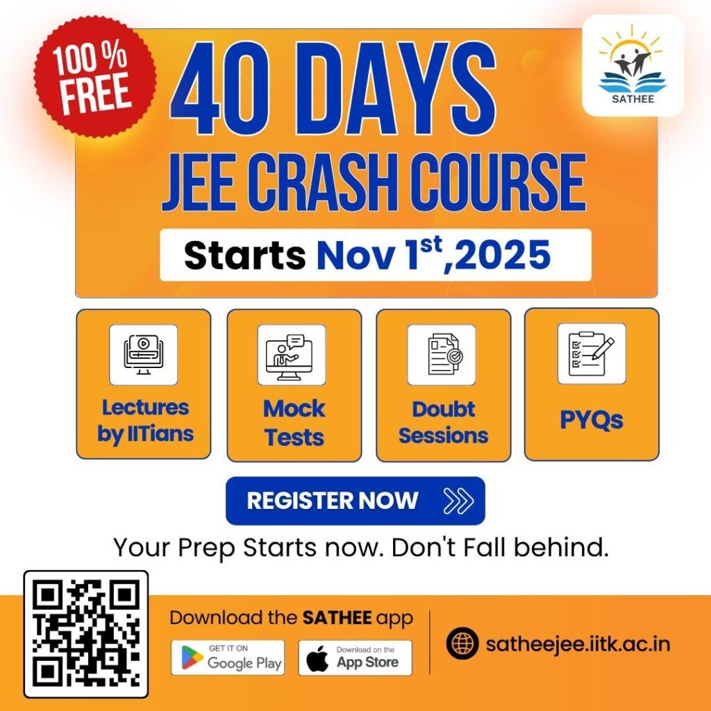 कानपुर| शिक्षा मंत्रालय की प्रमुख पहल SATHEE (Self-Assessment Test and Help for Entrance Exams) के तहत भारतीय प्रौद्योगिकी संस्थान (IIT Kanpur) ने जेईई मेन जनवरी 2026 सत्र की तैयारी कर रहे अभ्यर्थियों के लिए 40-दिवसीय निःशुल्क ऑनलाइन क्रैश कोर्स शुरू किया है।