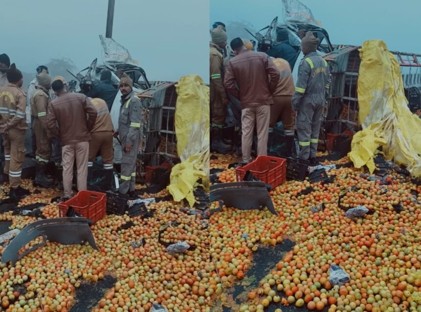 कानपुर | उत्तर भारत में पड़ रहे भीषण कोहरे और धुंध ने अब सड़कों पर अपना कहर बरपाना शुरू कर दिया है। औद्योगिक नगरी कानपुर के यशोदा नगर इलाके में मंगलवार सुबह एक रोंगटे खड़े कर देने वाला हादसा सामने आया। घने कोहरे के कारण दृश्यता कम होने से टमाटरों से लदी एक तेज रफ्तार पिकअप वैन अनियंत्रित होकर यशोदा नगर फ्लाईओवर के डिवाइडर से जा टकराई। टक्कर इतनी जबरदस्त थी कि वाहन का अगला हिस्सा पूरी तरह पिचक गया और दो युवक उसमें बुरी तरह फंस गए।