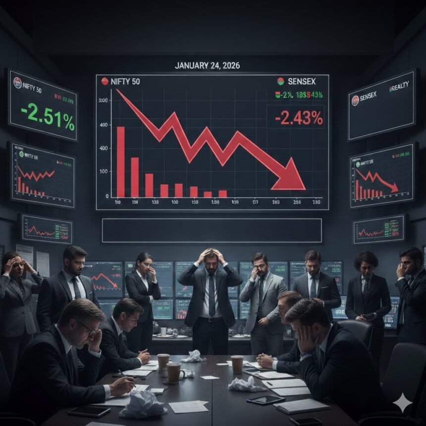 बाजार के हर सेक्टर में बिकवाली का दबाव दिखा। सबसे ज्यादा असर रियल्टी सेक्टर पर पड़ा, जो 11.33% तक टूट गया। इसके अलावा कंज्यूमर ड्यूरेबल्स, टेलीकॉम और स्मॉलकैप इंडेक्स में भी 5% से अधिक की गिरावट देखी गई। हफ्ते के आखिरी कारोबारी दिन सेंसेक्स 769 अंक गिरकर 81,537 पर और निफ्टी 25,048 के स्तर पर बंद हुआ।